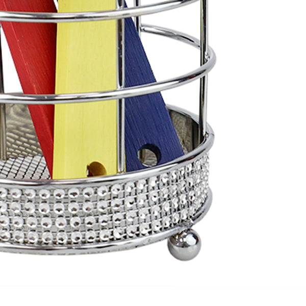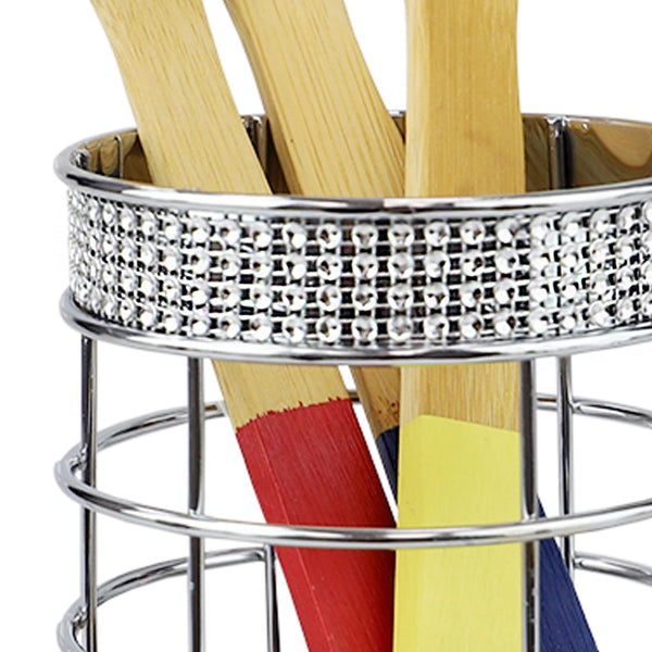 Have your most frequently used cooking tools at the ready with the Pave Rhinestone Utensil Holder. Designed to contain multiple utensils, it’s great for containing whisks, serving spoons. The durable steel design supports the weight of a set of flatware, utensils and cutlery. The wide mouth makes it easy to grab the utensil you need when you need. With non-skid metal feet, it sits evenly on countertops, picnic tables, and buffet tables. With its ornate rhinestone beaded detailing along the top and bottom of the holder it doubles as both a stylish kitchen accessory. The ventilated mesh bottom also makes it great for draining damp silverware after washing. Be sure to dry the unit thoroughly and wash with warm water and mild soap.