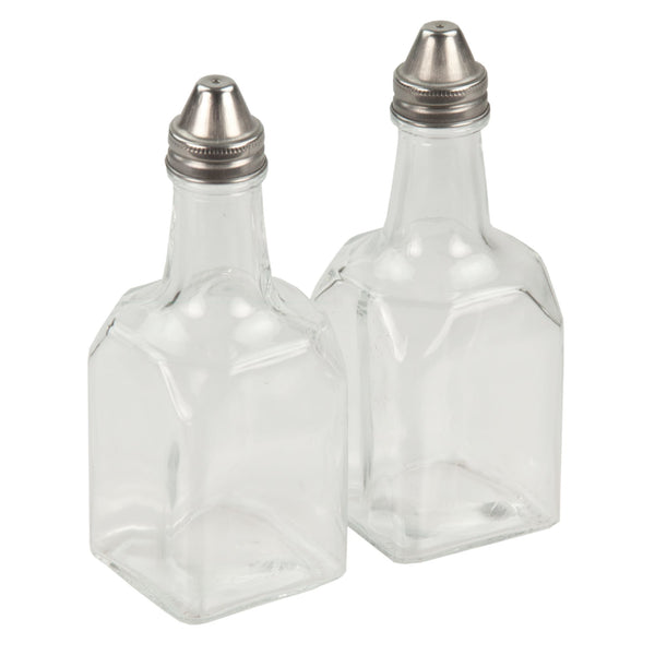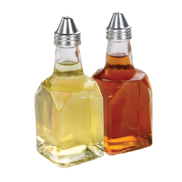 A perfect addition to any dinner table or kitchen setting, this 2 piece oil and vinegar set holds up to 18 oz. Each oil and vinegar bottle is fitted with stainless steel tops to preserve the flavor of condiments, sauces and more. Tip the holder over to dispense. The clear glass base makes it to know when its time for a refill.
